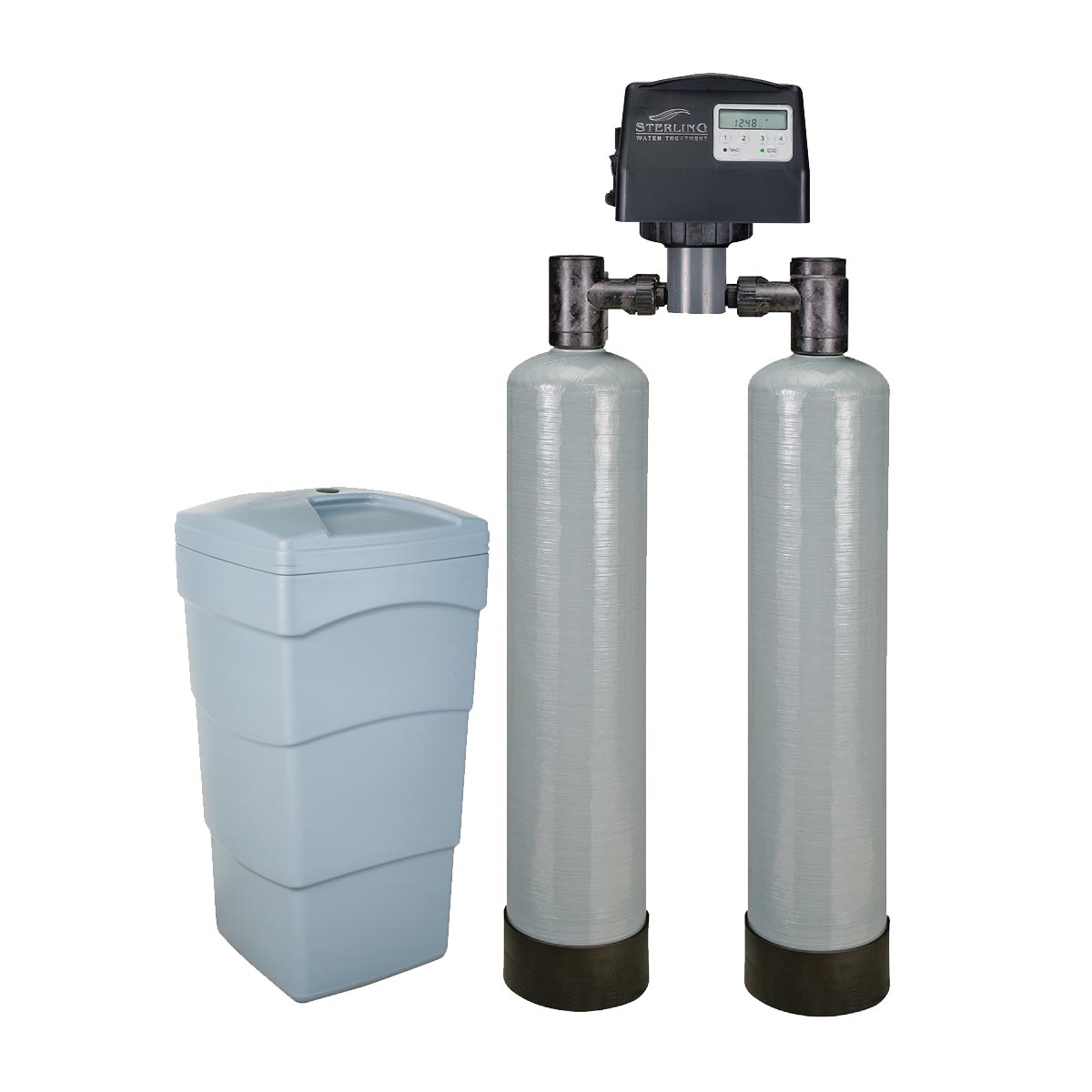 The CTX water softener system includes a brine (salt) tank and a resin (media) tank with a backwashing control valve. Incoming water flows into the control valve and is directed down through the carbon and then the ion exchange softening resin. The carbon absorbs chlorine to remove taste and odor and to protect the softener resin. The softener resin exchanges the hardness ions for softer ions. The softened water then returns to the control valve where it is directed into the service lines. The CTX Series water softener/filter is designed to be installed on chlorinated municipal water supplies